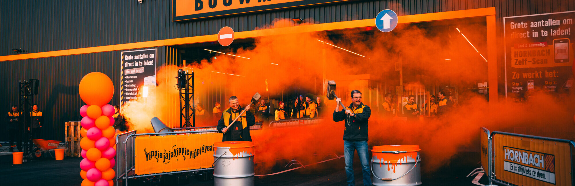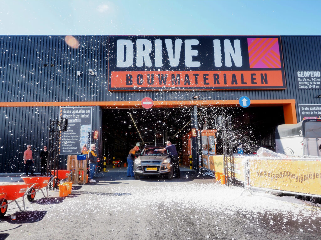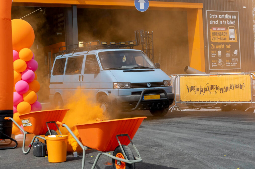 De opening was niet te missen. Aan een reusachtige kraan hing een groot doek met de aankondiging dat de Drive In open is. Dankzij een rooktunnel en muziek aan de voorkant van de projectbouwmarkt, wist iedereen dat er iets feestelijks aan de hand was bij HORNBACH Geleen. Klanten werden getrakteerd op koffie met iets lekkers. Eenmaal in de feestelijk aangeklede Drive In stonden klanten een paar onverwachte verrassingen te wachten. Zoals leuke gadgets om hun auto te versieren, een hilarische carwash met een bladblazer en een grote knop waar klanten op konden drukken waarna er een luid ‘YippiejajaYippieYippieYeah!’ klonk door de hele Drive In. Het bezorgde menig klant een glimlach van oor tot oor.